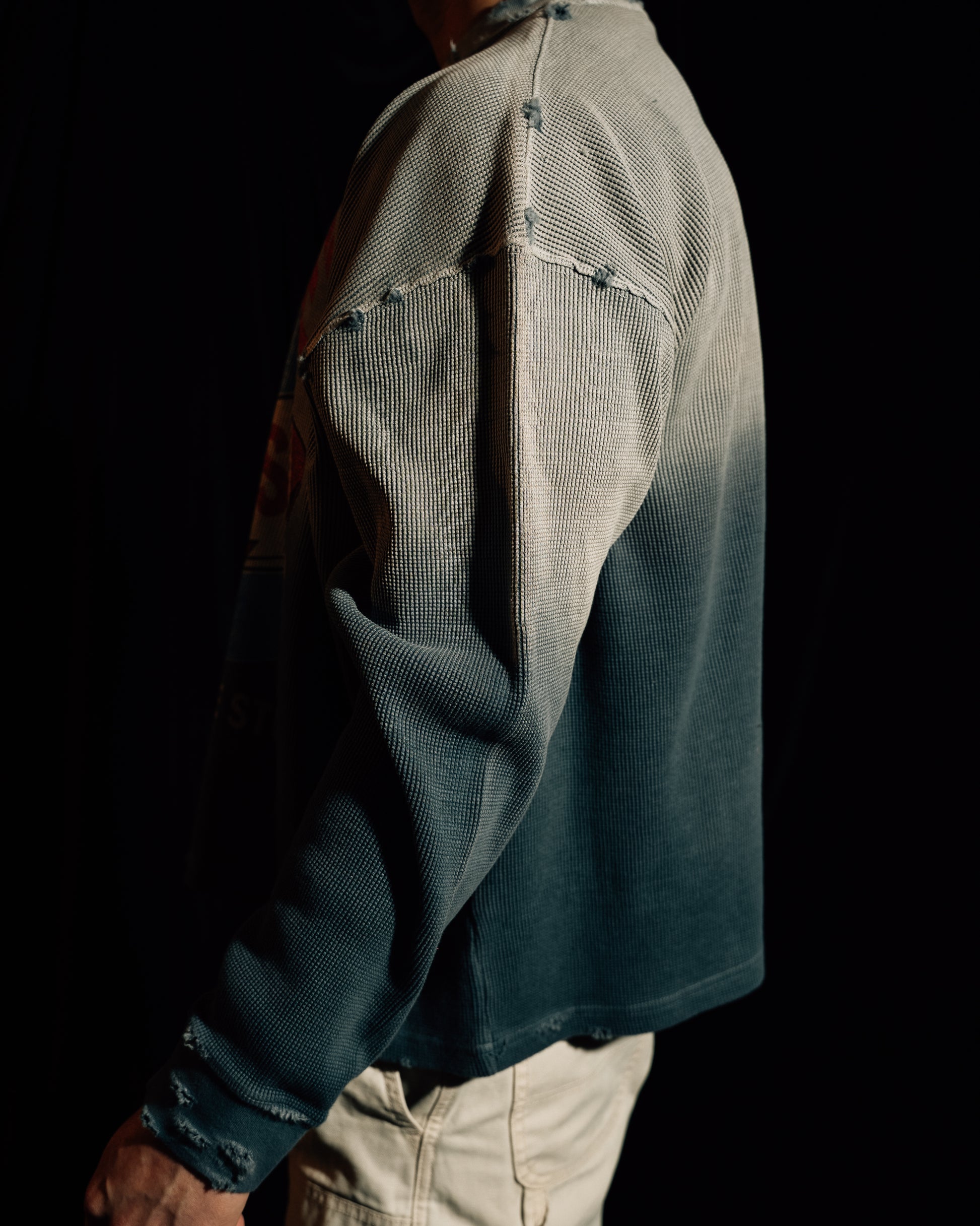 Blue Thermal longsleeve, with planet design printed on the front. Distress marks and rips all along the tee as well.